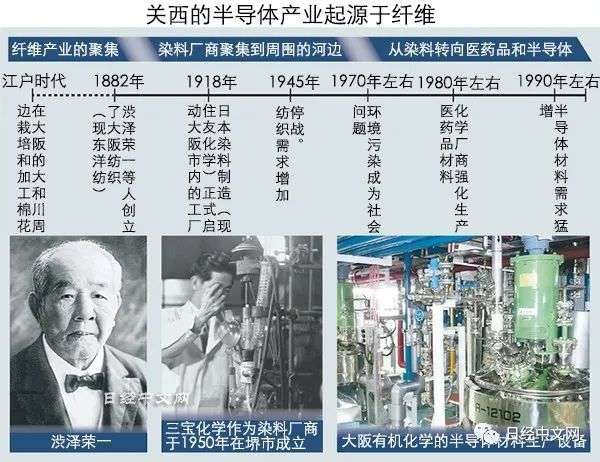 关西的核心和中小化学厂商有很多涉足了日本占有优势的半导体材料领域。这些企业的起源要追溯到19世纪后半期在关西发展起来的纤维产业。回顾历史,虽然遇到了纤维产业的衰退和环保问题,但也浮现出一批顺应时代变化生存下来的企业。