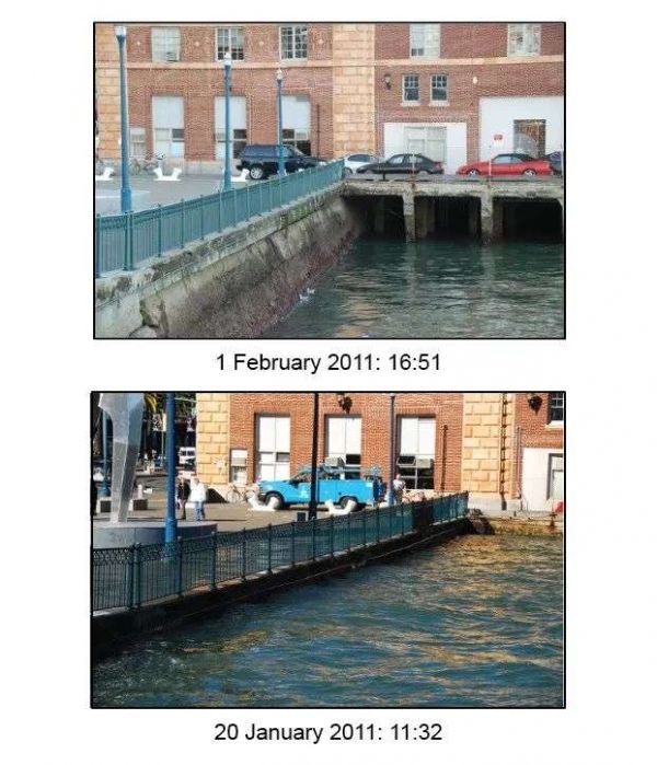 2011年1月20日,加州旧金山的近地点大潮(下)和普通潮汐(上)的对比。图片来源:toolkit.climate.gov