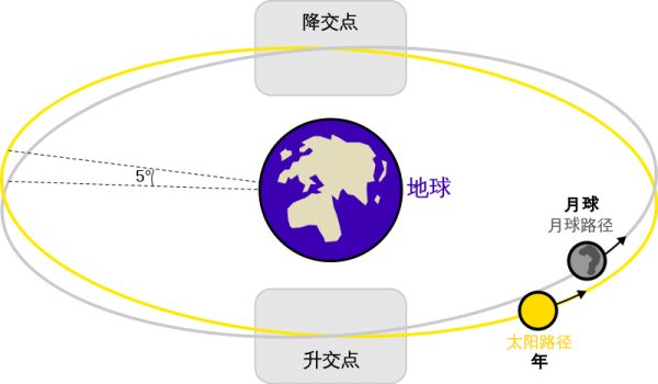 月球交点:月球公转面(灰)和地球公转面(黄)的交点。图片来源:wikipedia