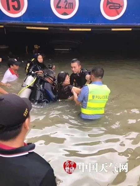 2017年8月,天鸽在珠海登陆时,珠海两名市民被困,潜水爱好者(疑似谢霆锋的黑衣侠士)自发组织救援。图片来源:中国天气网