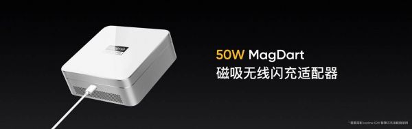 realme的MagDart无线磁性式充电器最高能支持50W快充。据realme方面的数据,这个充电器也可以让realme的一款搭载4500 mAh电池的概念手机,在5分钟内充电到20%,在54分钟内充至100%,充电速度几乎与有线的50W智慧闪充相同,是MagSafe的8倍。