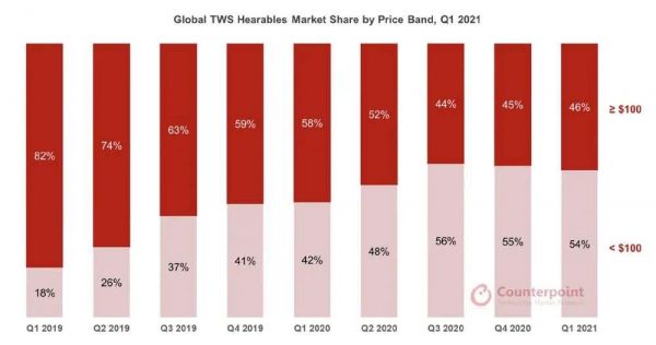 ▲Counterpoint Research 2021年第一季度按价格区间划分的全球TWS耳戴式设备市场份额