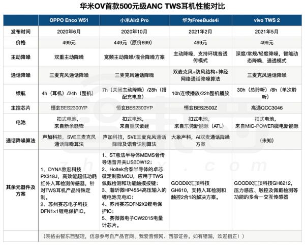 我们将华为、小米、OPPO、vivo四位玩家的首款500元级ANC TWS耳机的供应链进行了比对,发现他们TWS耳机的核心零部件、算法及解决方案大部分实现了国产替代,在一定程度上也有相似性。