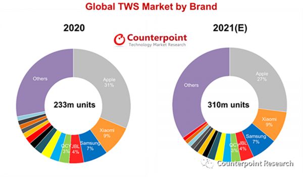 ▲Counterpoint Research全球TWS耳机市场规模及预测(2020年-2021年)
