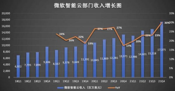 根据微软最新财报数据显示,2021财年Q4,微软智能云部门的营收为173.75亿美元,同比增长30%。