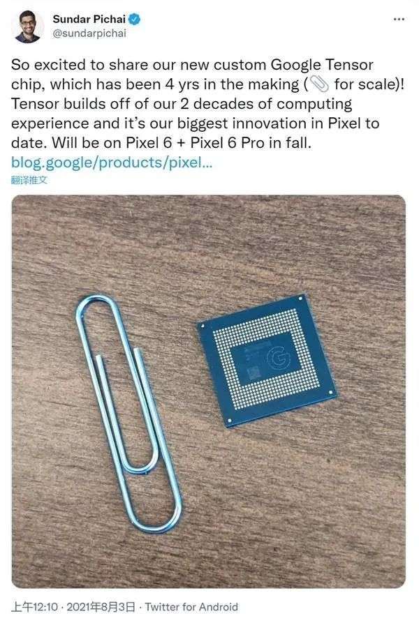 8月3日,谷歌及谷歌母公司Alphabet CEO Sundar Pichai在推特晒出了谷歌自研芯片Tensor。据劈柴哥介绍,谷歌定制的Tensor芯片历时4年打造,是谷歌Pixel系列史上最伟大的创新,它将会被应用到今年秋季发布的谷歌Pixel 6和谷歌Pixel 6 Pro上。有媒体报道称,谷歌自研芯片Tensor代号为Whitechapel,可能由三星代工生产。