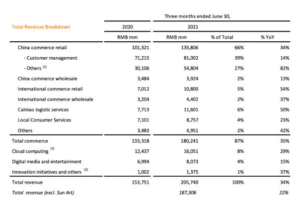 电商业务中较为欣喜的是国际业务。阿里的Lazada,AliExpress, Trendyol和Daraz非常给力,截至2021年6月30日的第一财季,阿里巴巴生态体系全球年度活跃消费者达到了11.8亿,较上一季度增加4500万。中国市场年度活跃消费者达9.12亿,以Lazada,AliExpress, Trendyol和Daraz为主的海外年度活跃消费者为2.65亿。这种增长不仅体现在用户上,同样体现在收入增长上。得益于国际业务的发展,阿里全球零售、批发市场的增速一直维持在较高的54%和37%。