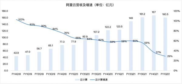 阿里云是增长潜力的业务,也可以说是目前不少投资者对阿里信心的来源。本季度来自云计算业务(cloudcomputing)的营收为人民币160.5亿元,同比增长29%,创下新低。相比本季度已经发布财报的谷歌,其云收入达到46亿美元,同比增长54%;与亚马逊相比,其AWS云服务净销售额为148.1亿美元,同比增长37%。两位国际玩家的云服务增速,都大于阿里云。