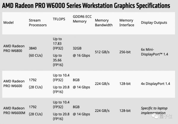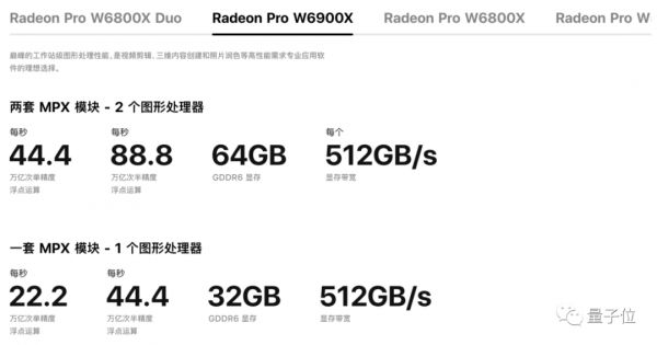 32GB GDDR6显存的AMD Radeon Pro W6900X,同样可以提供高达 512GB/s 的显存带宽。