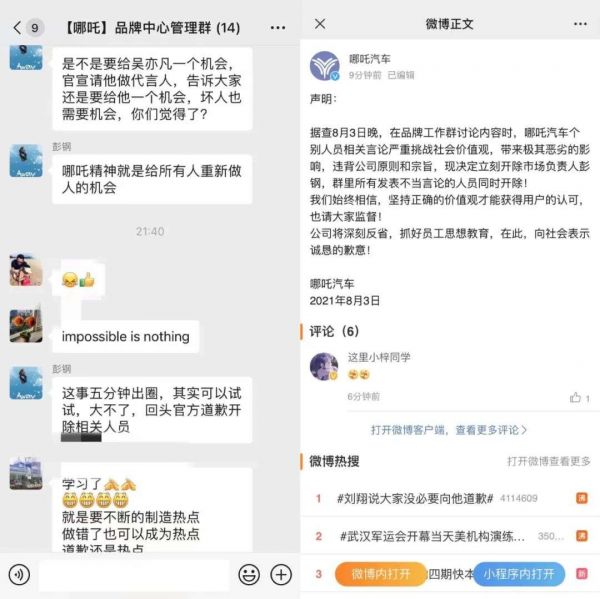 作为市场负责人的彭钢,其“剑走偏锋”的蹭热点大法堪称是自杀式营销。该图片流传不久,哪吒汽车就在官方微博发布声明称要“立刻开除市场负责人彭钢,群里所有发表不当言论的人员同时开除”。“情商之低超越道德底线”、“作死”等评论在网络上也不绝于耳。