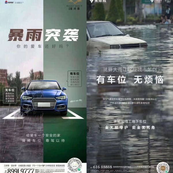 能犯如此低级错误的还不止康桥。河南本土房地产企业永威置业发布了“就算大雨让城市颠倒,有车位无烦恼”的宣传语;亚星集团主题为“暴雨突袭,你的爱车还好吗”的海报上,还配上了汽车室内外对比图,称无车位“露宿街头、暴雨冲刷、爱车报废、人更受罪”。