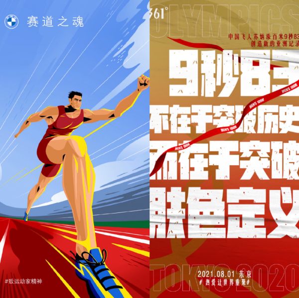 在这种情况下,品牌合理、合法地蹭冠军热度,就需要一定技巧。比如苏炳添百米跑刷新黄种人记录后,361度、阿迪达斯等运动品牌都发布了庆祝海报,这些品牌无一例外都没有放苏炳添本人的照片,也没有指明姓名。这样一来,既蹭上了热点、规避了法律问题,同时还让品牌有了种“拟人化”的情绪表达,让大众认为品牌也和自己一样在为冠军喝彩。