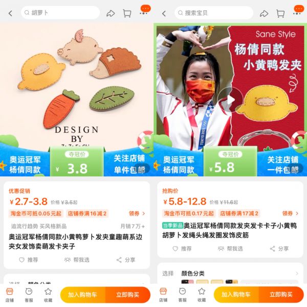 敏锐的商家自然也很快注意到这个信息。据时代财经报道,某位淘宝店主出于职业习惯,在一眼看到冠军头上的发卡时就觉得会火。于是他就将同款商品组图替换上了“杨倩同款”的文案,价格下调为一件包邮,并给商品买了推广确保流量。接下来几天,伴随着新闻报道及各种热搜,“原本一天只卖一两百件的小黄鸭发卡,现在半天就能卖上万”。凭借追着热点打爆款,和这位商家一起行动的淘宝商家们都或多或少地蹭到了热点。