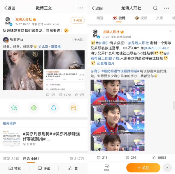 此外,拿下双人10米跳台冠军的张家齐在采访时表示自己最喜欢的礼物是芭比娃娃,网友“考古”其社交主页发现她想要的礼物是价格相对高昂的Ball Joint Doll(BJD娃娃)。虽然家齐本人在直播中表示不需要网友亲自破费,自己可以买,但原创BJD品牌龙魂人形设很快就在社交媒体上放话要送冠军一个,此举自然也大获好评。