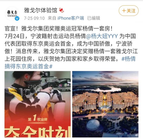 杨倩夺冠后,雅戈尔地产直接在官微表示要送奥运冠军一套房产,以庆贺她为国家和家乡取得荣誉。雅戈尔官宣时杨倩本人对“送房产”并不知情,于是不少网友开始质疑雅戈尔地产是在蹭热点打广告。但随后雅戈尔站出来公开了立场,证明这不是口头声明,而是真心赠予的祝福,并详细解释将要赠予奥运冠军的是此前留存的样板房,具体事宜要等冠军回来之后再作商讨。网友也因此开始声援雅戈尔,表示“物有所值”。