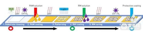 1)玻璃清洁;2)光控取向材质涂层;3)光控取向材质图形化;4)活性液晶原涂层;5)活性液晶原固化;6)组装。