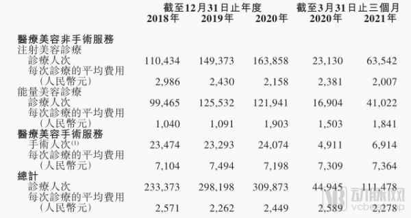 手术类的医疗美容服务方面,2018年至2020年,收入分别为1.78亿、1.87亿、1.84亿,占比22%至27%。其中,医疗美容手术服务手术人次为6914,每次诊疗的平均费用为7364,价格在整个服务体系中处于高位。