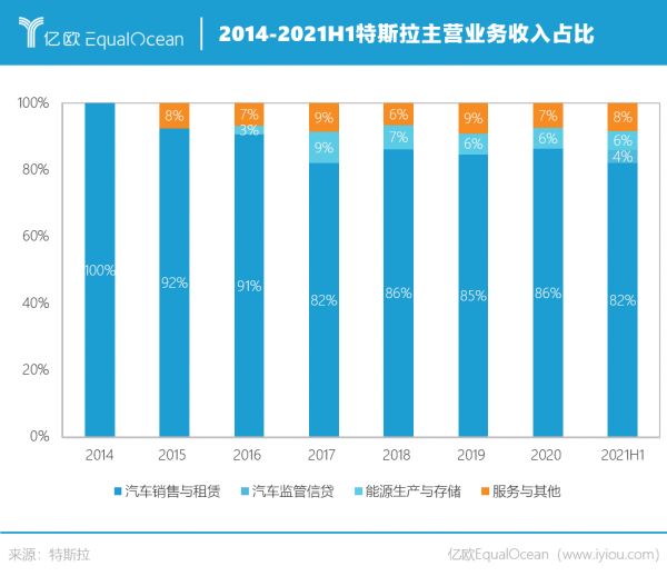 亿欧EqualOcean通过分析特斯拉的业务构成发现,特斯拉在服务、能源生产和存储板块上的收入比例,正在逐步拉大。2021年上半年,特斯拉的服务、能源生产和存储板块营收比重已达到14%。