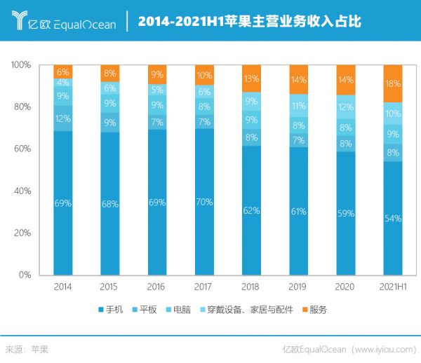 2021年上半年,苹果的服务收入比例再次提升,已占总营收的18%。
