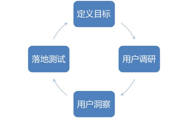 笔者结合平时的工作整理,把这套调研的流程分成“四部曲” ,从定义目标开始,找到用户调研的方向,通过搜集到的反馈和数据进行用户洞察,最后找到差异化的定位来进行落地测试。
