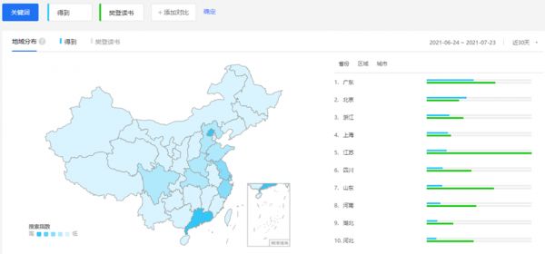 比如百度指数,通过和竞品关键词对比,我们可以至少从用户所在的城市、性别、年龄三个维度来发现用户群的差异。笔者以“得到”和“樊登读书”为例,通过百度指数,我们可以很明显的发现这两个产品在用户群上具备非常大的差异性: