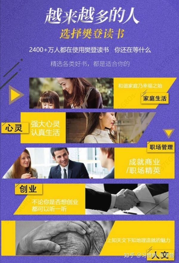 如果你听过樊登读书的话,会知道樊登读书的内容会更多的偏家庭生活(如育儿)、心灵和职场管理的话题,而这几类又恰恰是女性经常关注的焦点。