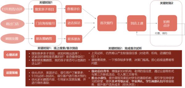 紧接着,我们选取了一部分报名课程的家长做了用户的访谈,提炼出一些购买课程的客户需求和使用场景后,结果让培训机构的管理人员“大跌眼镜”。原先,大家以为家长会冲着“中美外教”、“国际艺术体系”这些卖点购买课程,实际上,从家长决策的角度,更多的会参考来自美团、大众点评的口碑推荐。还有一个有趣的洞察是,家长给儿童报美术课程,不单单是为了培养孩子兴趣。由于美术绘画课程一般要持续90-120分钟左右,家长一般在这个过程可以得到放松,可以在购物中心去购物,买买东西等等。