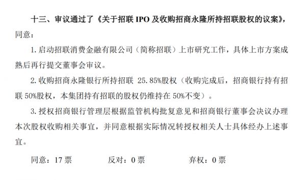 今年3月18日,招商银行发布《招商银行股份有限公司第十一届董事会第二十二次会议决议公告》,公告内容显示,会议审议通过了《关于招联IPO及收购招商永隆所持招联股权的议案》,其中第一项为启动招联上市研究工作,具体上市方案成熟后将再行提交董事会审议;第二项为招商银行收购招商永隆银行所持招联25.85%股权。