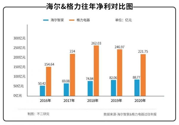 对应到净利润端,「不二研究」发现,在传统白电三巨头中,海尔智家净利润处于低位。若拉长时间线,海尔智家2016年-2020年的净利润分别为50.42亿元、69.08亿元、74.84亿元、82.06亿元和88.77亿元。