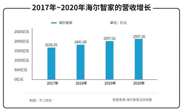 抛开疫情黑天鹅不论,「不二研究」发现,海尔智家的营收增长也遇到瓶颈,其在2017年-2020年的营收分别为1634.29亿元、1841.08亿元、2007.62亿元和2097.26亿元,同比增长37.18%、12.65%、9.05%、4.46%,营收增速逐年下降,明显放缓。