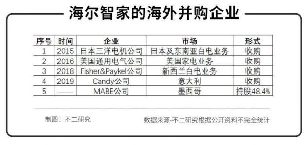 「不二研究」不完全统计发现:海尔智家于2015年收购日本三洋电机公司的日本及东南亚白色家电业务,于2016年收购美国通用电气公司的家电业务,于2018年收购Fisher&Paykel公司,并于2019年收购Candy公司。目前,海尔智家旗下有海尔、卡萨帝、统帅、美国GEA、新西兰Fisher&Paykel、日本AQUA、意大利Candy等品牌。