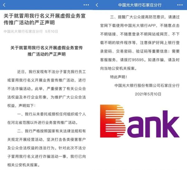 不过最后“合作”还是终止了,老黄所在单位与光大银行取得联系,光大银行工作人员告诉老黄,已经报警,并发布相关声明。