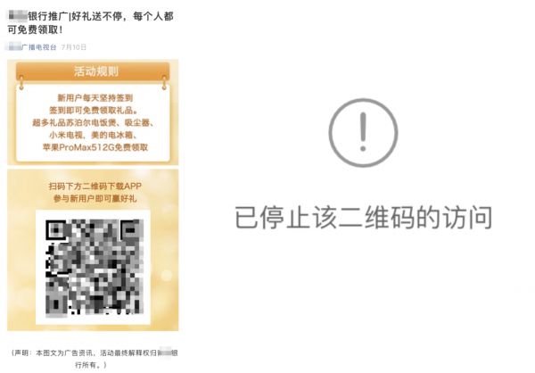 目前,搜索“银行推广”等关键词,还有部分媒体公众号并未删除骗局海报,但扫描二维码后都显示“二维码已过期”或“已停止该二维码的访问”。