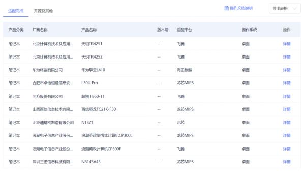 而系统预装少、推广难和用户心理抵触,成了国产桌面操作系统难以推向大众市场的现实问题。 在统信官网的“生态适配清单”里可以看到,在笔记本类别里显示“适配完成”的产品中,大多数产品都比较“冷门”,支持的也都是龙芯、麒麟、兆芯等平台,不是市面上常见的电脑品牌和处理器型号。