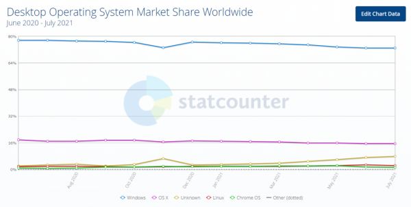 目前的国产桌面操作系统并不是大多数人的选择,根据网站通讯流量监测机构StatCounter的数据,在2021年7月桌面操作系统全球份额中,Windows和OS X(Mac OS)排名前两位,两者市场份额合计超过88%。从数据来看, 尽管Windows的市场份额有所下降,但依旧稳稳占据市场第一的宝座,而Linux份额仅有2.38%, 在列表中之所以还未看到国产桌面操作系统,其中的因素就包括系统预装和软件生态两个方面。
