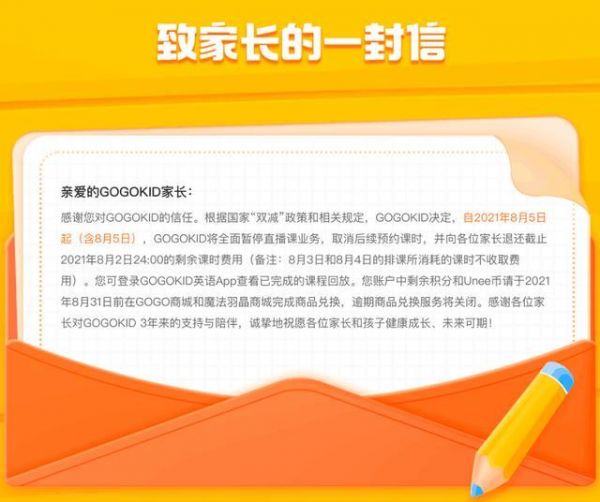 据悉,「你拍一」和一对一外教 GOGOKID 两款应用目前已经下架。因为《双减》严禁聘请在境外的外籍人员开展培训活动。GOGOKID 官方也证实了这一消息——GOGOKID 发布了《致家长的一封信》,宣布自 8 月 5 日起将全面暂停直播课业务,取消后续预约课时,退还费用。