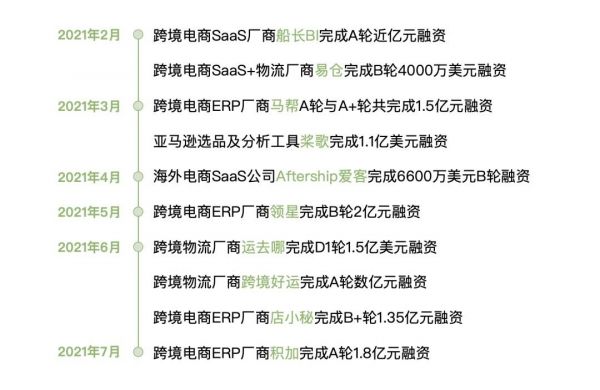 进入2021年,跨境ERP融资实火,船长bi、马帮、领星、店小秘、积加等厂商分别获得亿元以上融资。