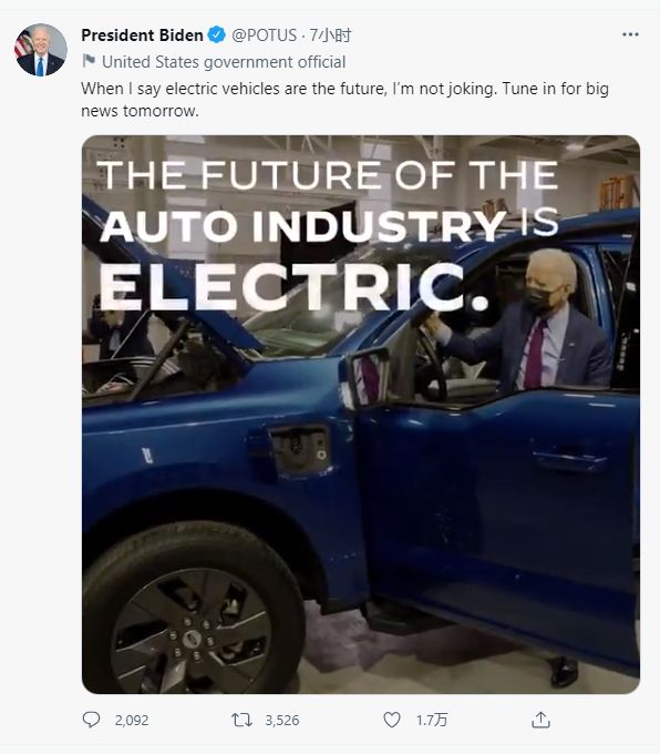拜登在推特上说:“当我说电动车是未来时,我不是在开玩笑。关注明天的大新闻。”