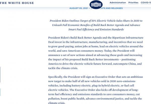 据上海证券报,会后,白宫官网“官宣”了拜登和主流车企达成的目标:在2030年前将电动车销量提升到新车销售总份额的40%至50%,并且宣布了一系列支持这个目标的具体举措。并称“这是拜登政府“重建更好未来”计划,提升智慧能源效率和排放标准的重要内容。”