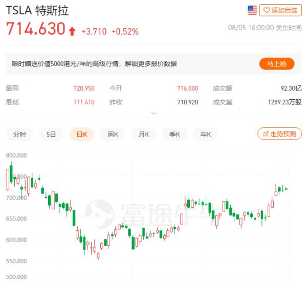 截至周四收盘,特斯拉涨0.52%,报714.63美元,市值7075亿美元。