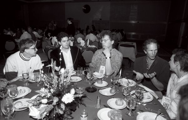 1992年在亚利桑那州举行的PC论坛上,比尔·盖茨(Bill Gates,左)与27岁的戴尔和太阳微系统公司联合创始人比尔·乔伊(Bill Joy)交谈。