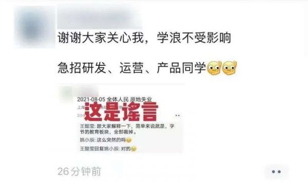 但没过多久,一位在大力教育学浪负责运营的人士便在个人朋友圈发文表示“谢谢大家关心我,学浪不受影响。急招研发、运营、产品同学”,并配图表示,上述消息为谣言。