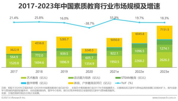 艾瑞咨询《2021年中国素质教育行业趋势洞察报告》显示,2021年中国素质教育行业市场规模为5050.0亿元。到2023年,这一数字或达到7151.5亿元。根据报告不难看出,这一素质教育行业规模包含了艺术教育、数学思维、科学教育以及体育、户外等等,但却依旧远不及中小学线上线下的学科培训规模。根据Frost & Sullivan 的预测,2023 年中小学线上线下的市场规模将达到上万亿元。