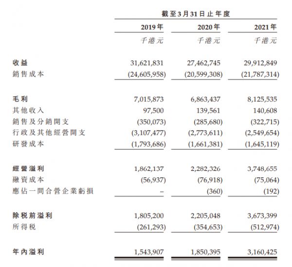 招股书显示,在过去的2019年、2020年、和2021年三个财政年度(年结日为3月31日),伯恩光学的营业收入分别为316.22亿、274.63亿和299.13亿港元,相应的净利润分别为15.44亿、18.50亿和31.60亿港元。