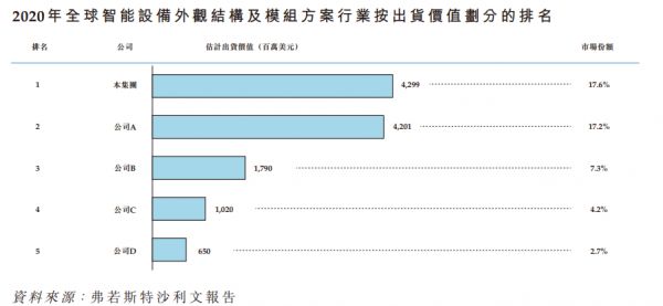 根据弗若斯特沙利文的资料,于2020年,按出货价值计,公司是全球最大的智能设备外观结构及模组方案提供商,占有17.6%的市场份额。