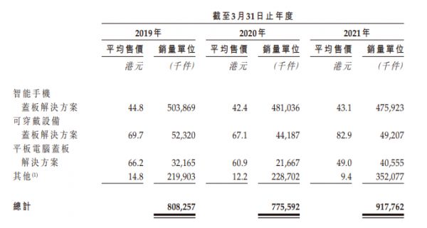 可穿戴设备盖板解决方案销量由截至2019年3月31日止年度的52.3百万台减少至截至2020年3月31日止年度的44.2百万台。
