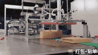 货物会在机器中间和纸箱会合,一套强有力的机械臂将根据货物尺寸自动完成折叠、打包、粘合以及封条等工作。最后,贴上物流单,一个订单就完成了: