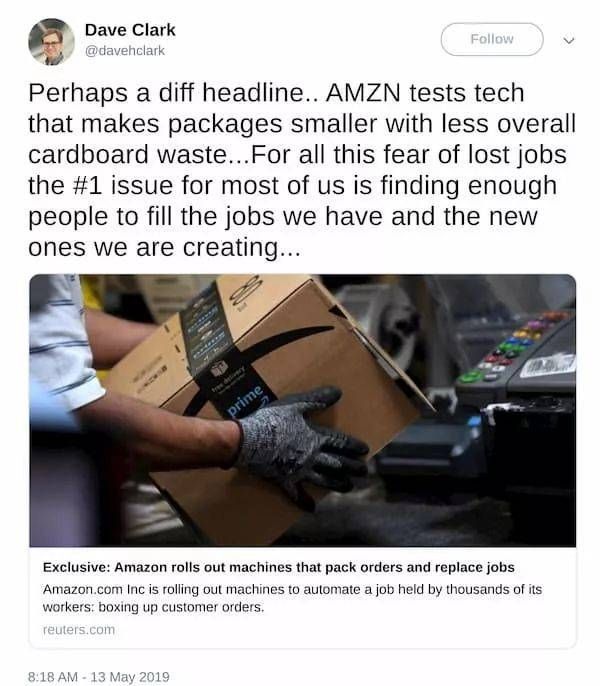 [1] Exclusive: Amazon rolls out machines that pack orders and replace jobs https://www.reuters.com/article/us-amazon-com-automation-exclusive-idUSKCN1SJ0X1?utm_source=reddit.com