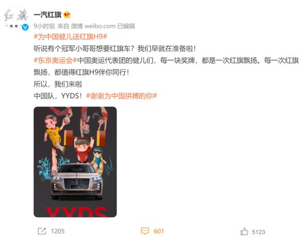 8月5日,有消息称,一汽红旗将给所有在本届东京夏季奥运会上,获得金牌的中国奥运健儿赠送一辆红旗H9,包含个人项目和团体项目的金牌获得者。