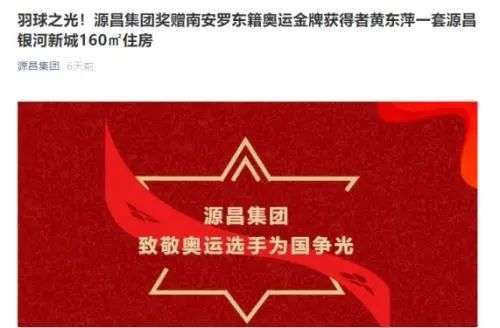 7月30日,厦门源昌集团有限公司在官方微信公众号上表示,集团奖赠南安罗东籍奥运金牌获得者黄东萍一套源昌银河新城160㎡住房。
